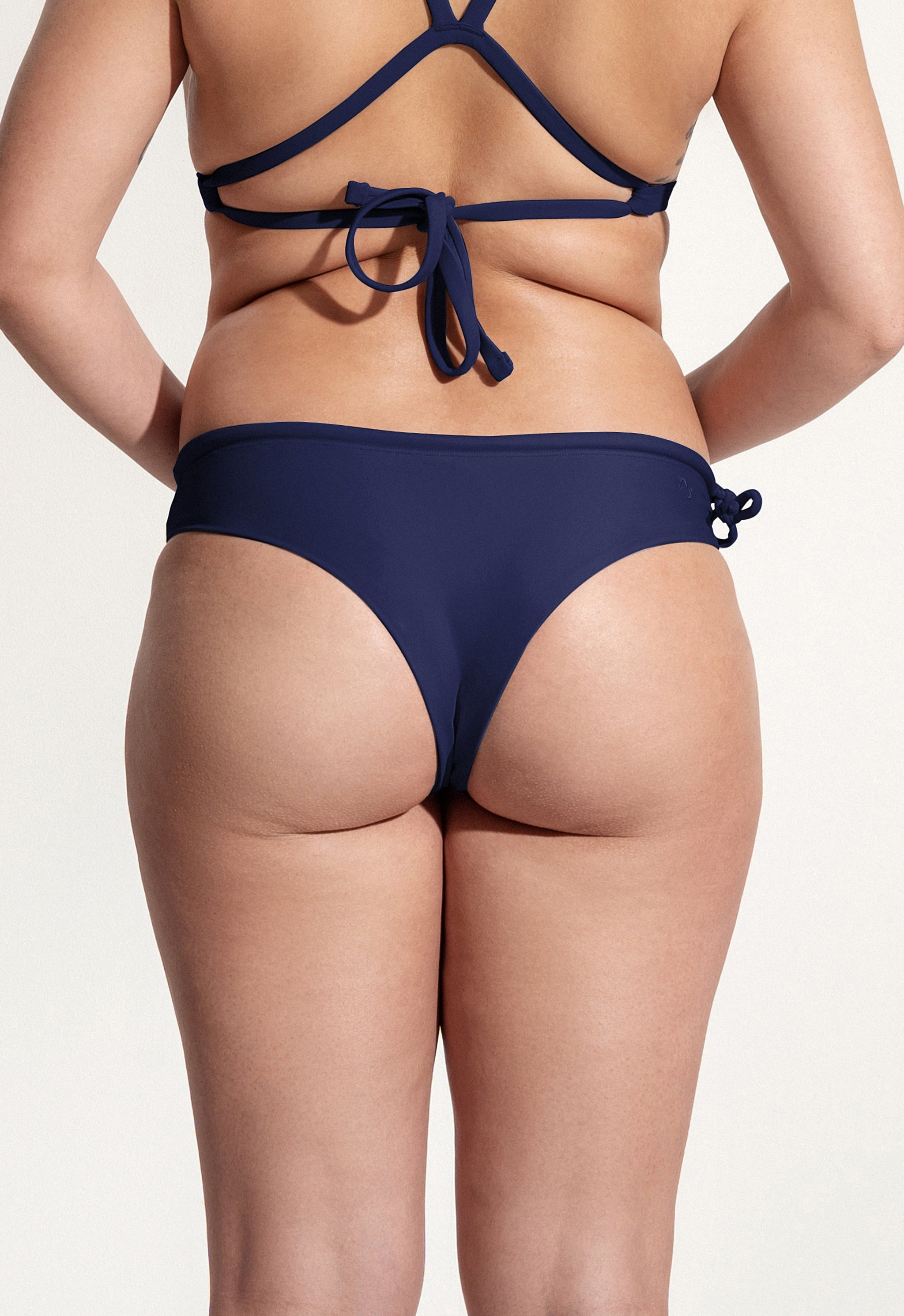 The high-quality finish with two layers of fabric made from recycled material allows nothing to show through. For this sustainable bottom, we use very high quality and eco-friendly material made from recycled plastic. For even more support, you can individually tighten and knot the waistband at the side. For the complete look combine “Tope” with one of our surf bikini tops. -